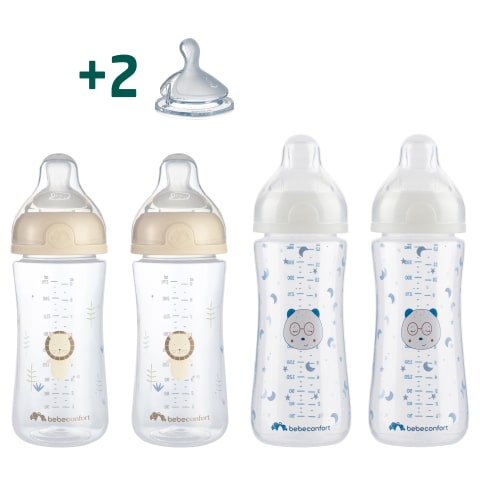 Each bottle comes with a specific teat to provide a precise flow rate adapted to baby’s age. Use S teat from birth, M teat from 3 months, and L teat from 6 months.